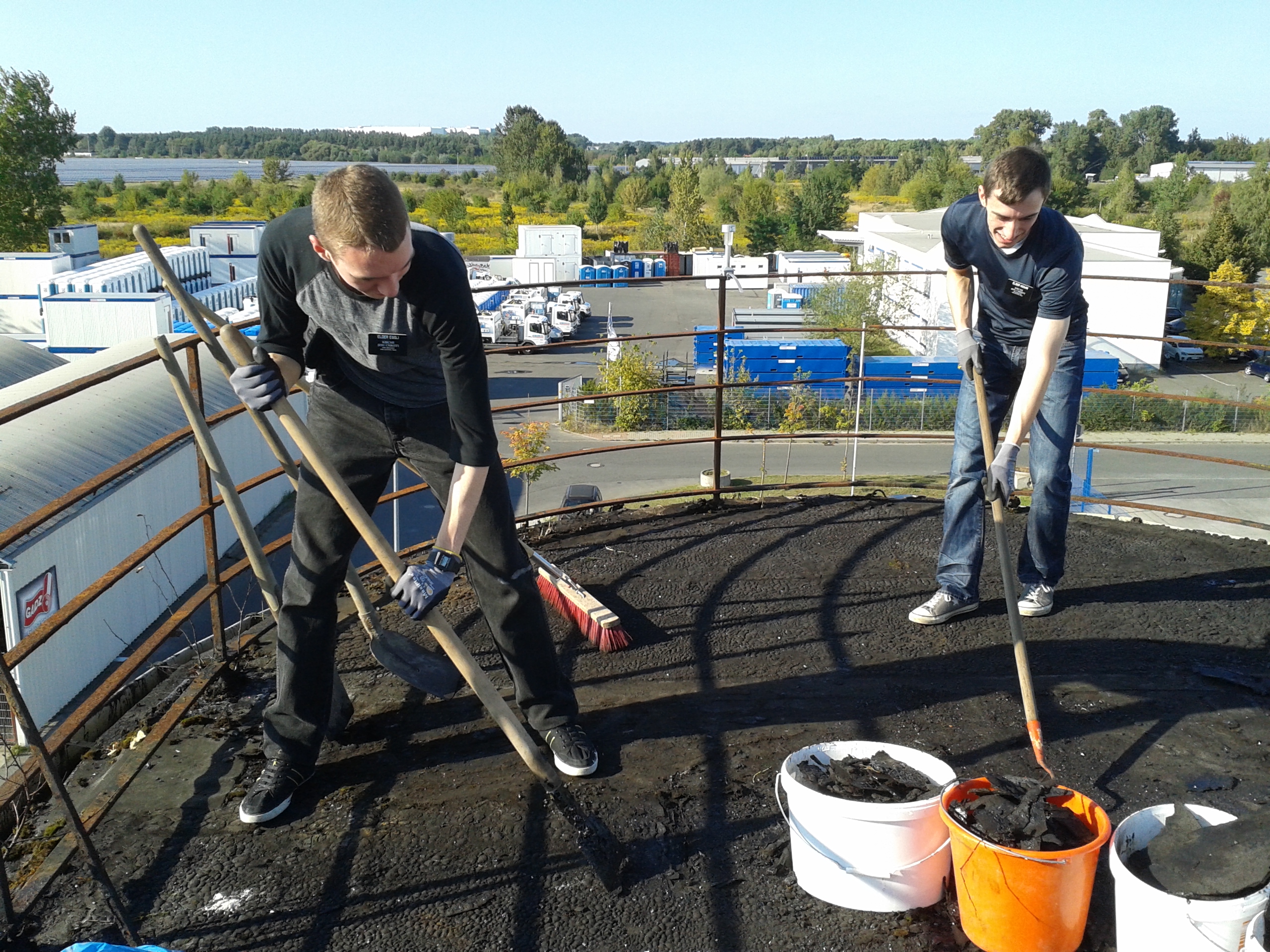 Aber bevor etwas neues kommen kann, muß die alte Dachpappe entfernt werden und der Beton darunter teilweise saniert werden.