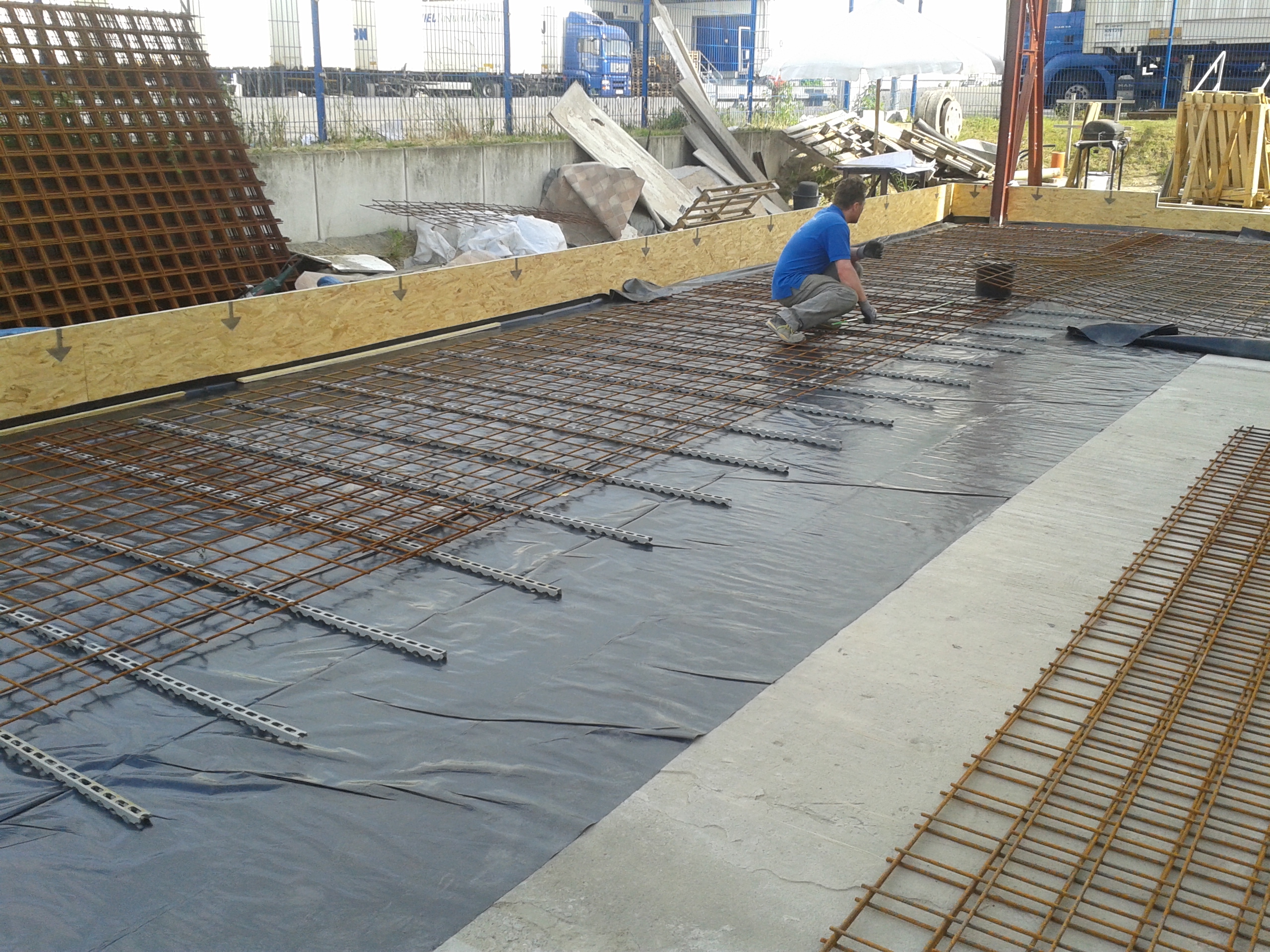 Nachdem die Streifenfundamente ausreichend Zeit zum Aushärten hatten, fingen wir an, die Randschalung für die Bodenplatte herzustellen. Eine Trennfolie (Sauberkeitsschicht) zur alten Betonplatte war schnell ausgelegt und wir fingen mit der Bewehrung an.
