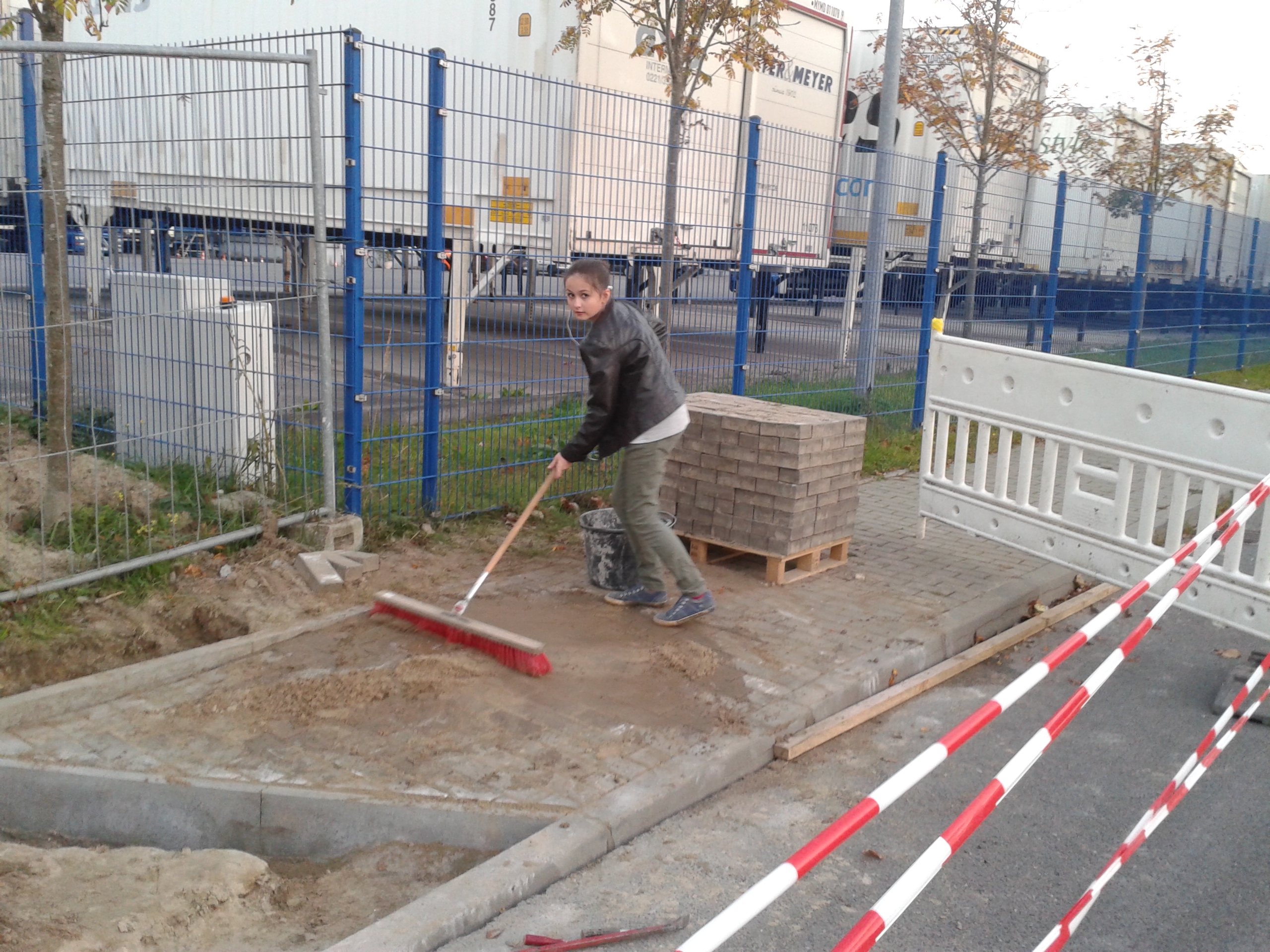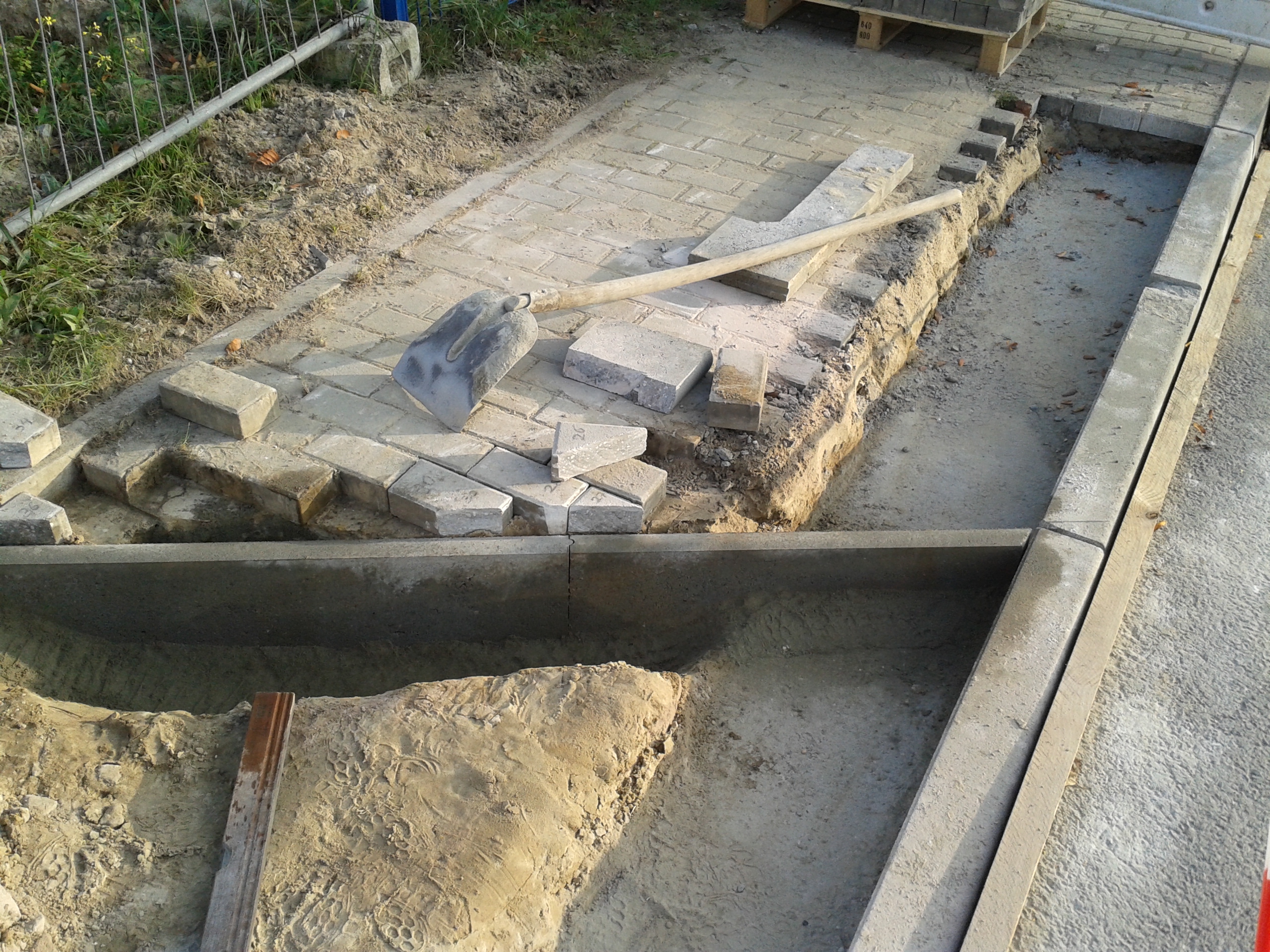 Es hat aber dann doch lange gedauert - vom Absperren des Gehwegs, Aufnehmen des Rechteckpflasters, Ausschippen des verdichteten Bodens, Schneiden und