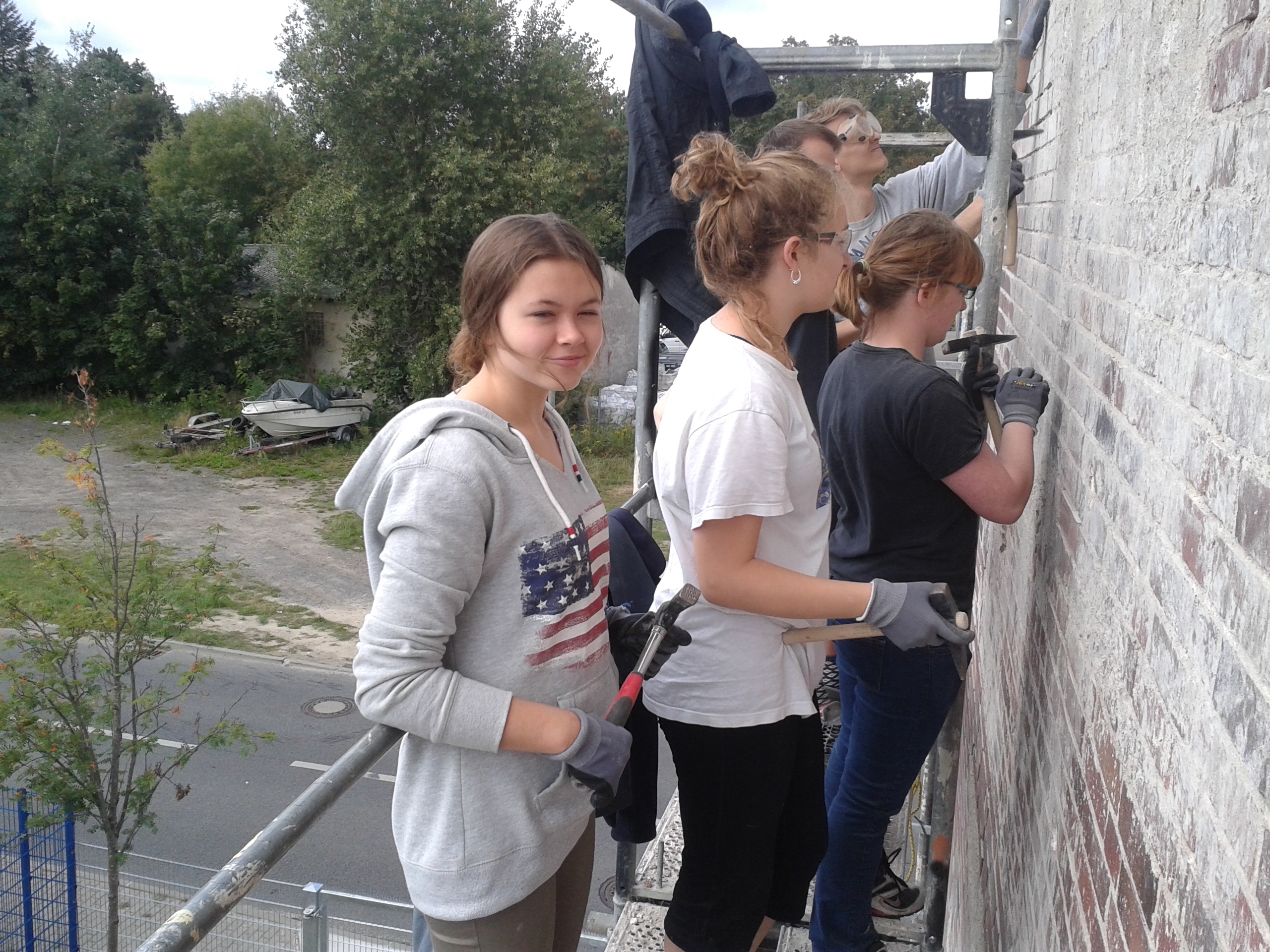 Nachdem Gilbert seit einigen Monaten das Mauerwerk repariert hat, haben wir versucht den Putz mittels HD-Reiniger zu entfernen. Leider mit nur mässigen Erfolg. So blieb uns nichts anderes übrig, als den Putz abzuhämmern. Sehr langwierig die ganze Sache.